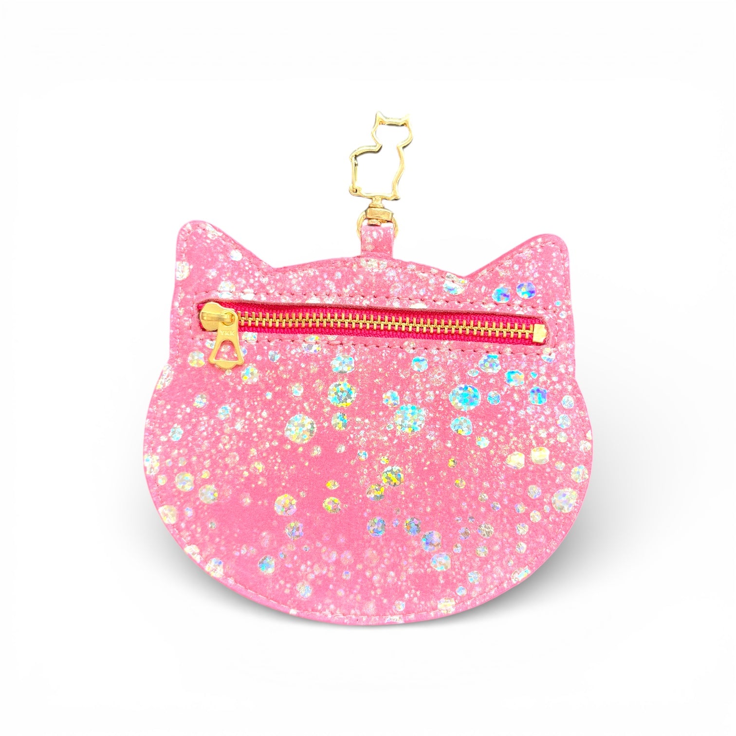 きらめくドット模様のレザーに、猫モチーフの金具を合わせた