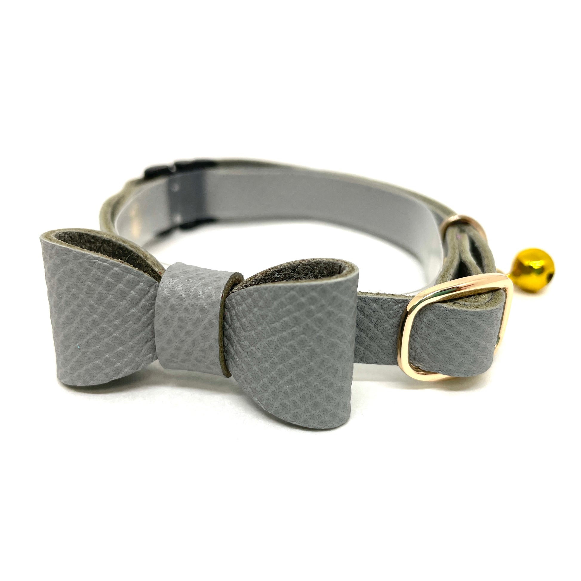 猫 首輪 革製 | ライトグレー | リボン付き|セーフティバックル|名前入れ|BLUEGE
